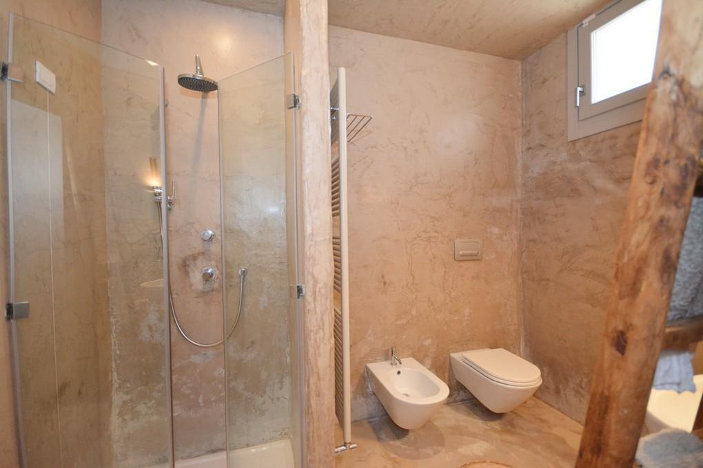 The house is built on two levels. On the main level there is the living area, divided between a sitting corner with a cozy built-in sofa where one can read or listen to the music (diffused in the whole house and in the outdoor verandah via an amplifying system), and the fully-fitted kitchen (5 stoves, electric oven, dishwasher) provided with large built-in pantries, stone-built island and a 10-12 seat table in white wood with copper inserts; this part of the house also comprises another little sitting room, a shower room and a characteristic inner courtyard, where one can peacefully enjoy a siesta in one of the hammocks.