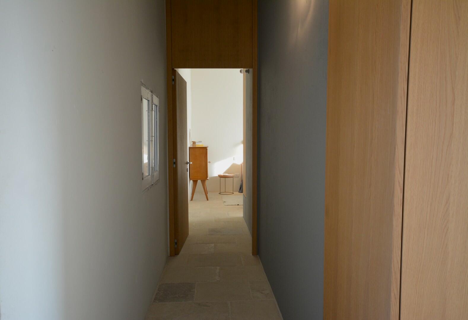 Du jardin on peut également sortir sur la ruelle qui côtoie la maison. Retournant à l'intérieur, on trouve l'accès à un cellier (fermé et pas utilisable) et, à côté de la cuisine, à un dégagement qui mène à deux chambres à coucher, l'une double, avec salle de bain privée, l'autre simple, avec salle de douche en-suite. À noter : ces chambres n'ont pas d'air conditionné étant donné que l'architecture originale les rend naturellement fraîches. Les deux chambres partagent une petite cour extérieure, joignable par les portes-fenêtres.
