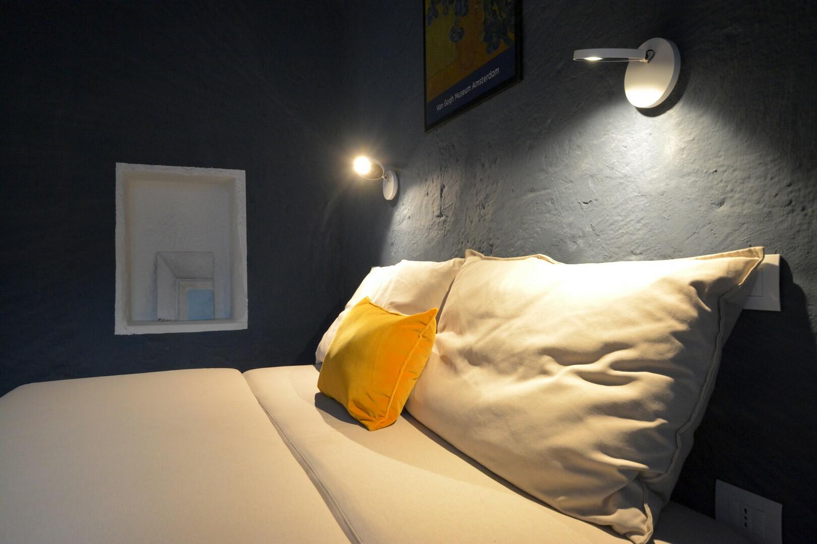 Toujours au rez-de-chaussée, retournant dans l'espace jour, de l'autre côté de la cuisine, on trouve des escaliers en pierre blancs de chaux, montant lesquels on accède d'abord au petit studio sur la mezzanine, et puis à un dégagement à l'étage supérieur menant à deux autres chambres doubles, l’une avec salle de douche en-suite et l’autre privée, et toutes les deux équipées d’air conditionné. Comme pour celles au rez-de-chaussée, ces chambres-ci ont également chacune la possibilité de sortir dehors sur une belle terrasse donnant sur les toits du village et en particulier sur l’arrière avec vitrail de l’église de Saint André. À noter : étant donné que la maison est à côté de l’église, on pourrait sentir sonner les cloches de temps en temps pendant le jour.