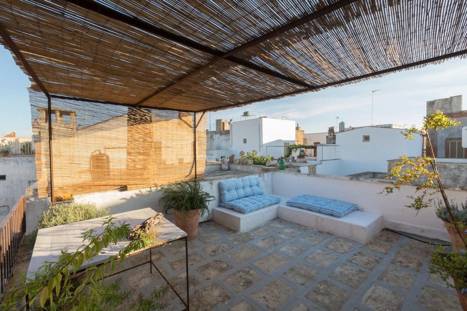 L'accesso principale apre ad un suggestivo ingresso, con un pavé in pietra leccese e pareti faccia vista che raccontano la storia di questa dimora. Da qui, lo sguardo è catturato dalla prima corte, mentre sulla sinistra si apre la cucina completamente attrezzata, che conduce alla sala da pranzo, inondata dalla luce che filtra dalla seconda corte. La prima corte apre ad un tesoro unico: una sala con due antiche vasche scavate nella roccia, dove immergersi in un viaggio sensoriale in cui il tempo si ferma, donando momenti di puro relax e benessere interiore. Sempre dalla prima corte, un’elegante scala conduce alla suite che si sviluppa su due livelli e si compone di una camera da letto matrimoniale con letto in pietra al piano inferiore, e bagno doccia, un angolo cottura e un terrazzo privato al piano superiore. Di fronte, una seconda scala conduce alla terrazza attrezzata, dove una pergola ombreggia un tavolo da pranzo, ideale per cene all'aperto sotto le stelle. Qui, la vista spazia sugli scorci pittoreschi del borgo e si apre sul luminoso soggiorno, un ambiente accogliente con TV con proiettore, una libreria a muro e un antico biliardo del 1800. Le pareti in pietra e il soffitto con travi in legno creano un'atmosfera calda e avvolgente. La seconda corte, con la sua splendida piscina, è il cuore pulsante della proprietà. Qui, nelle calde giornate estive, ci si può tuffare in un'oasi di frescura e relax. Questa corte rappresenta anche il fulcro per accedere alle camere da letto del piano terra, di cui due camere matrimoniali, totalmente indipendenti ed una terza camera, accessibile dal disimpegno con toilette che collega le due corti, composta da due stanze comunicanti: una camera doppia e una matrimoniale con letto rotondo, ideale per famiglie o coppie con bambini. Ogni camera dispone di un bagno privato en-suite, un dettaglio di lusso che garantisce privacy e comfort.